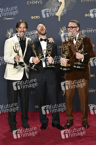 James Weaver, Evan Goldberg und Seth Rogen mit den Emmys für die beste Comedy-Serie 'The Studio' beim Preisträger-Photocall der 77. Primetime Emmy Awards 2025 im Peacock Theater. Los Angeles, 14.09.2025