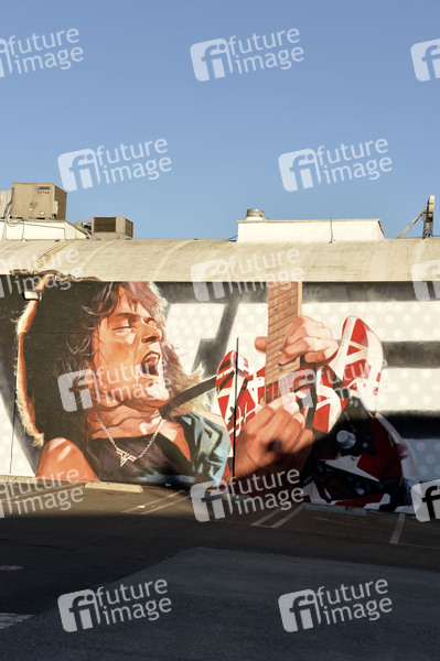Wandgemälde von Eddie Van Halen im Guitar Center am Sunset Boulevard - Die Straßen von Los Angeles sind menschenleer. Kinos und Theater sind geschlossen. Kalifornien ist der Staat der USA mit den meisten Covid-19-Todesfällen. Los Angeles, 06.03.2021