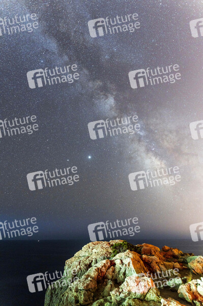 Die Milchstraße über Cala Rajada. Das Milchstraßensystem besteht aus etwa 100 bis 300 Milliarden Sternen und großen Mengen interstellarer und Dunkler Materie. Cala Rajada, 20.07.2020