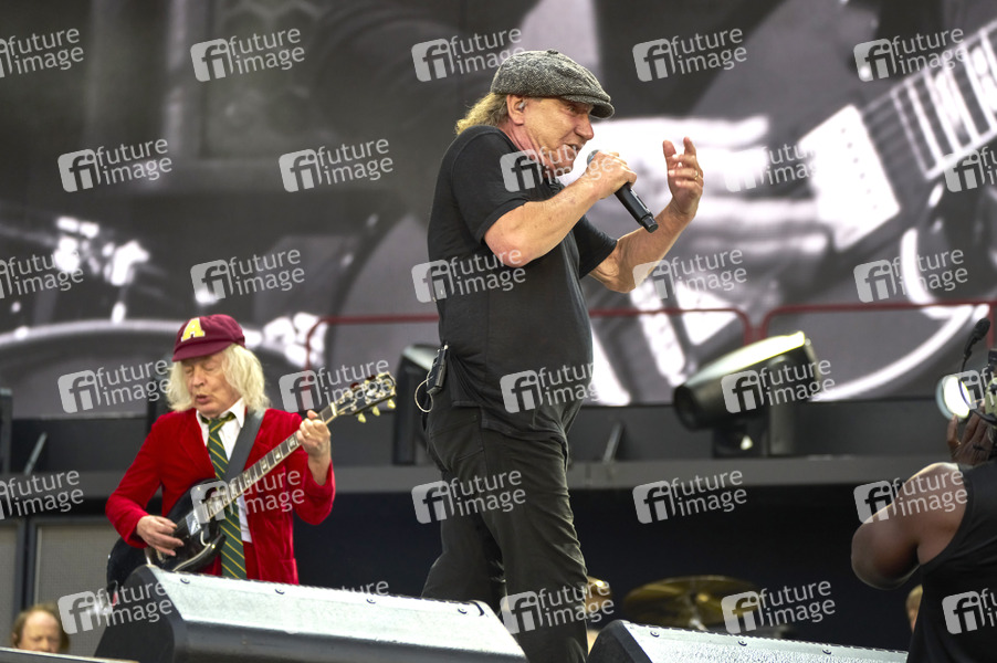 Angus Young und Brian Johnson von AC/DC live bei einem Konzert der 'Power Up'-Tour auf dem Messegelände. Hannover, 31.07.2024