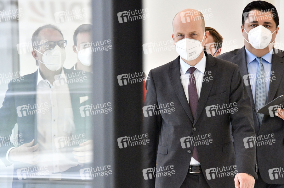 Alexander Dobrindt und Ralph Brinkhaus bei einem Pressestatement der CDU/CSU-Bundestagsfraktion vor der Fraktionssitzung auf der Fraktionsebene im Reichstagsgebäude. Berlin, 13.04.2021