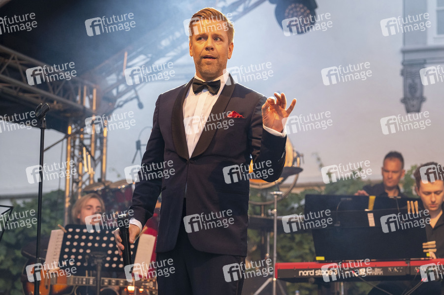 Tom Gaebel mit der Lumberjack Swing-Band unter der Leitung von Alexander Eissele live bei einem Konzert auf Schloss Filseck. Uhingen, 13.07.2024