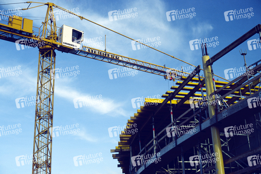 Bau, Bauten, bauen, Baustelle, Aufbau, Rohbau, Architektur, Hochbau, Kran, Krane, Transport, tragen, heben, Last, Lasten, Sicherheit, Arbeitsplatz, Arbeit, arbeiten, Arbeitsschutz, Helm, Helme, Lohn, Lohndumping, Konjunktur, Staedtebau, Verschalung, Geruest, einruesten
