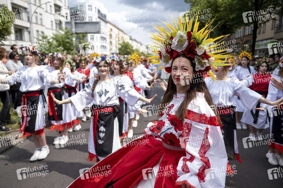 Die Parade zum 27. Karneval der Kulturen zieht durch Berlin-Friedrichshain. Etwa 4000 Tänzer in etwa 70 verschiedenen Gruppen und Umzugswagen nehmen an der Parade teil. Berlin, 08.06.2025