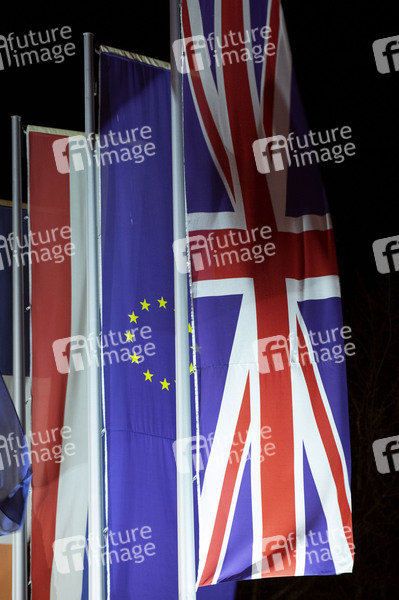 Flaggen Europa und Vereinigtes Königreich am Europa Park. Rust, 20.02.2020