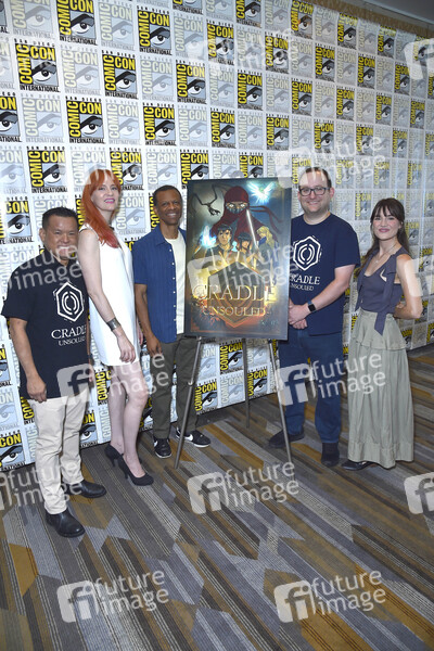 Jay Oliva, Morla Gorrondona, Phil LaMarr, Will Wight und Maxine Phoenix beim Photocall zur Animationsserie 'Cradle Unsouled' auf der San Diego Comic-Con International 2024 im Hilton Bayfront Hotel. San Diego, 25.07.2024