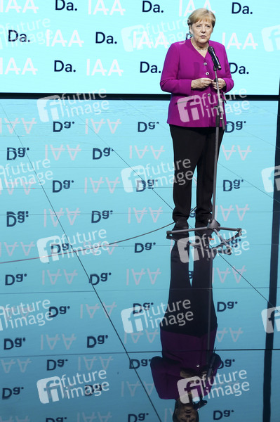 Angela Merkel beim Abschlussstatement am Messestand von BMW beim Eröffnungsrundgang auf der Internationalen Automobil-Ausstellung 2019 auf dem Messegelände. Frankfurt am Main, 12.09.2019