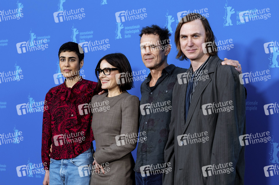 Tala Al Deen, Nicolette Krebitz, Tom Tykwer und Lars Eidinger beim Photocall zum Kinofilm 'Das Licht / The Light' auf der Berlinale 2025 / 75. Internationale Filmfestspiele Berlin im Hotel Grand Hyatt. Berlin, 13.02.2025