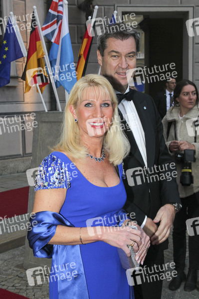 Markus Söder mit Ehefrau Karin Söder beim Empfang der britischen Royals zum Staatsbankett vor der Residenz München. München, 09.05.2019