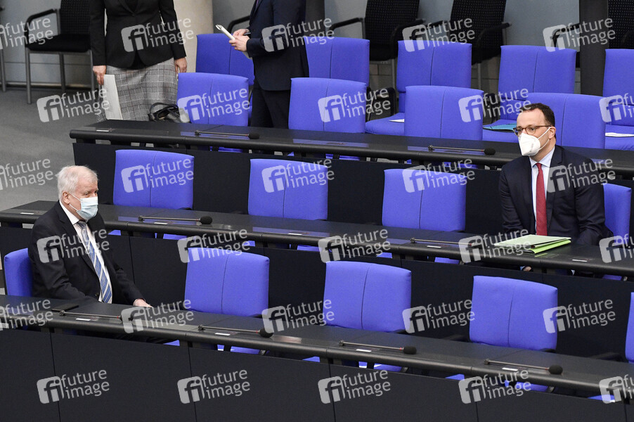 Horst Seehofer und Jens Spahn in der 223. Sitzung des Deutschen Bundestages im Reichstagsgebäude. Berlin, 21.04.2021