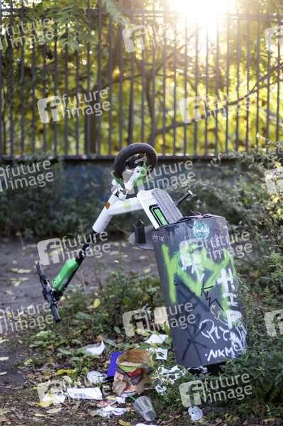 Entsorgter E-Scooter des Anbieters Lime in einem Mülleimer am Zoologischen Garten. Berlin, 28.10.2019