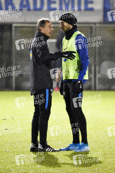 Jürgen Klinsmann und Mathew Leckie beim ersten Training von Hertha BSC mit neuen Trainerteam im Olympiapark-Amateurstadion. Berlin, 27.11.2019