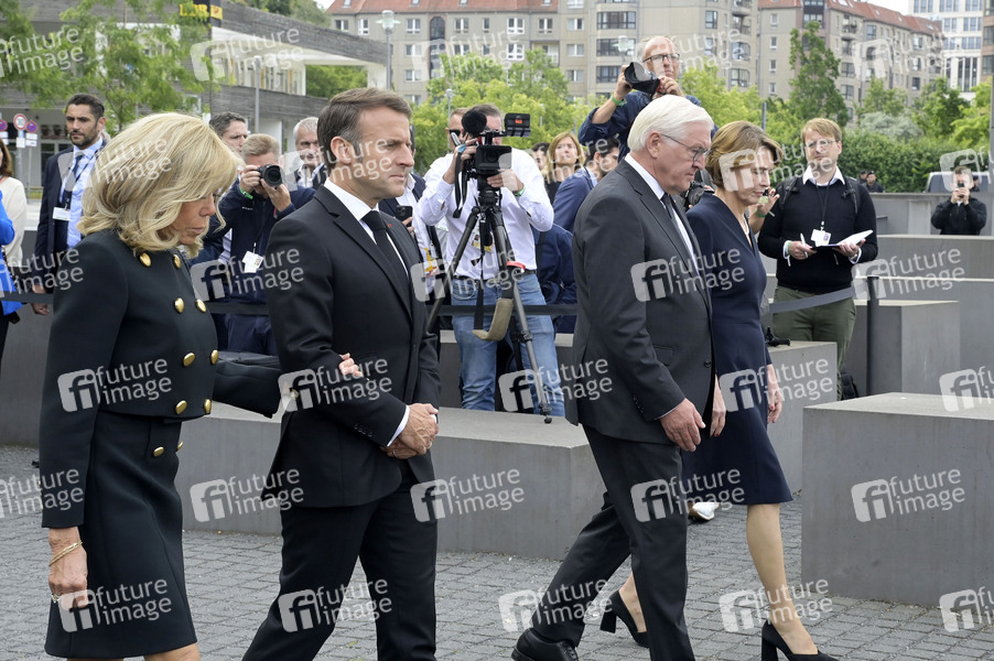 Brigitte Macron, Emmanuel Macron, Frank-Walter Steinmeier und Elke Büdenbender bei der Kranzniederlegung am Denkmal für die ermordeten Juden Europas. Berlin, 27.05.2024