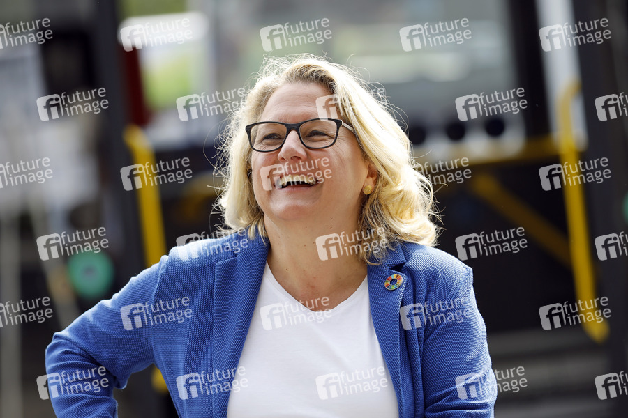 Svenja Schulze beim Besuch von Umweltministerin Svenja Schulze und NRW-Verkehrsminister Hendrik Wüst bei der KVB Köln mit symbolischer Inbetriebnahme der neuen Ladeinfrastruktur für Elektro-Busse. Köln, 29.06.2021