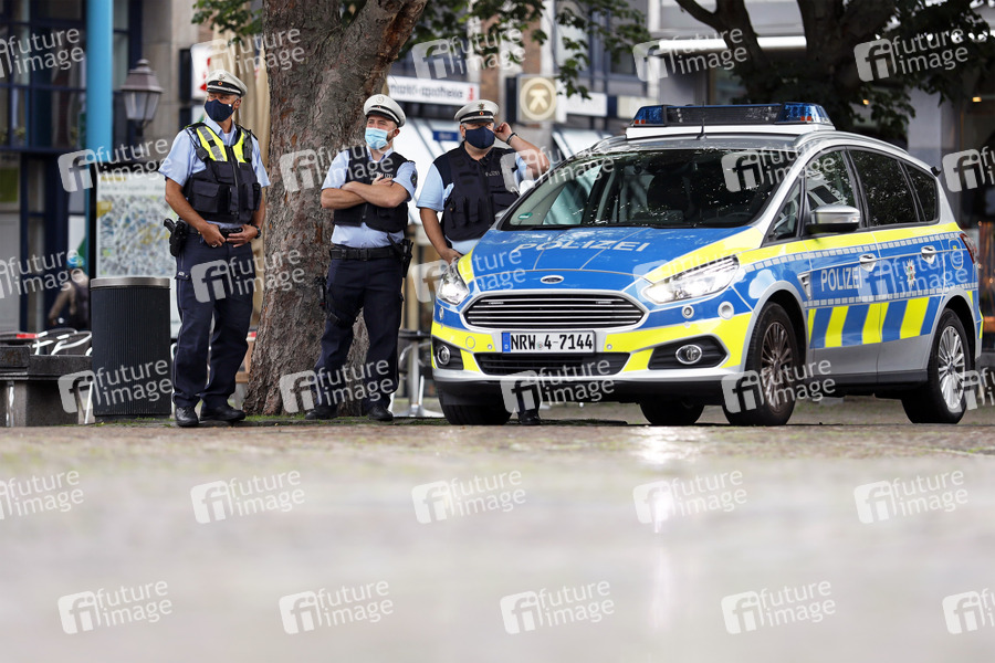Polizisten der Polizei Aachen stehen vor dem Aachener Rathaus und tragen Mundschutz aufgrund der Coronakrise. (Themenbild, Symbolbild) Aachen, 09.07.2021