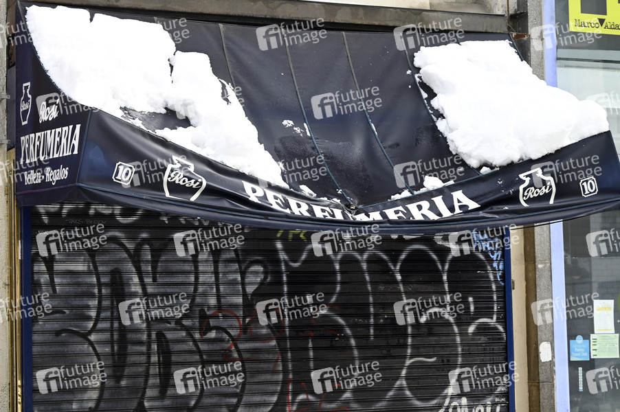 Kaputte Markise auf der Einkaufstraße Gran Vía - Die Region Madrid nach dem Sturmtief Filomena, das in weiten Teilen Spaniens mit starken Schneefällen für Chaos sorgte. Starker Schneefall legte das öffentliche Leben nahezu lahm. Seit 50 Jahren hatte es nicht so geschneit. Madrid, 10.01.2021