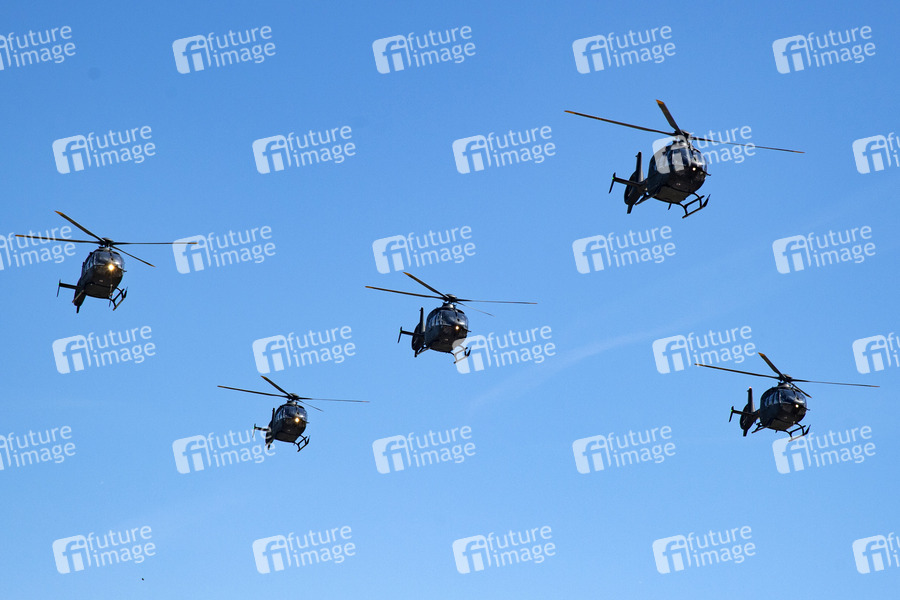 Militärhubschrauber bei der Zeremonie der Übergabe der Nationalflagge an die ACAVIET (Luftfahrtakademie der Armee) in der Helipuerto Base Coronel Mate. Colmenar Viejo, 07.05.2021