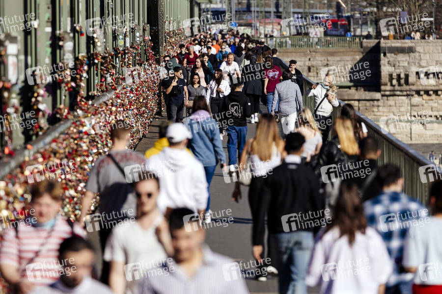 Bei sonnigem Wetter und frühlingshaften Temperaturen tummelten sich viele Passanten in der Kölner City. In Köln gelten in der Innenstadt strenge Corona-Maßnahmen wie Maskenpflicht und Mindestabstand. Seit Montag gilt die Corona-Notbremse in Kreisen und kreisfreien Städten in NRW, Sieben-Tage-Inzidenz über 100 liegen. Die Notbremse ist in der Corona-Schutzverordnung verankert. (Themenbild, Symbolbild) Köln, 29.03.2021