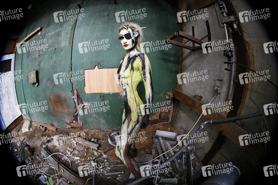 Bodypainting und Photoshooting mit Model Jutta auf einem Industriegelände in Hameln. Bodypaint-Künstler: Jörg Düsterwald, Make-Up und Hairstyling: Nadja Lück