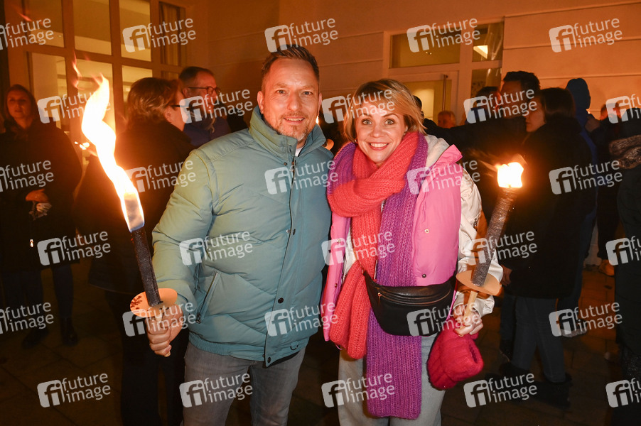 Lars Pape und Gisa Zach beim Opening der Baltic Lights 2025 mit Fackellauf an der Seebrücke Heringsdorf. Heringsdorf, 28.02.2025