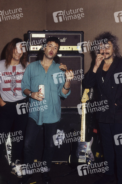 Michael 'Würzel' Burston, Phil 'Wizzö' Campbell und Phil 'Philthy Animal' Taylor von Motörhead bei einem Photoshooting im Tonstudio. London, 12.12.1991