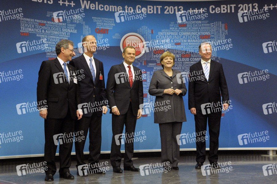 Dieter Kempf, Thomas Enders, Donald Tusk, Angela Merkel und Stephan Weil bei der Eröffnungsfeier der CeBIT 2013 im Hannover Congress Centrum. Hannover, 04.03.2013