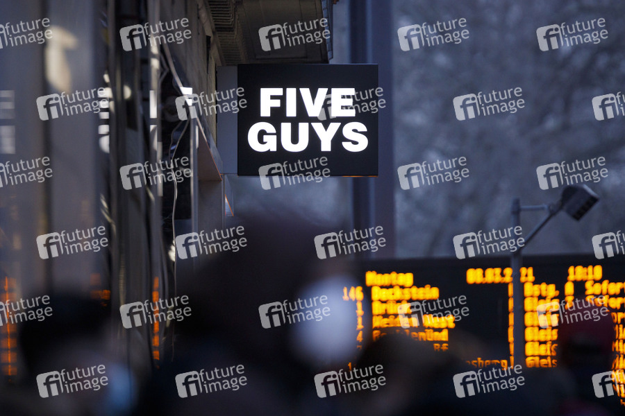 Burger, Burgerrestaurant, Restaurant, Five Guys-Logo, Schnellgastronomie, Gastronomie, Fastfood, Ernährung, Essen, Hamburger, Fritten, Fries, Toppings, Fast Food, Restaurantkette, Burgerkette, Burger-Kette, Fast-Food-Riese, Symbolbild, Symbolfoto