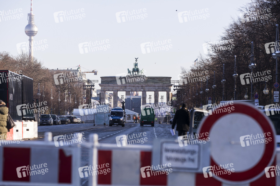 Vorbereitungen und Absperrungen zur jährlichen Silvesterfeier am Brandenburger Tor. Aufgrund der COVID-19-Abstandsregeln findet die Feier dieses Jahr nur als Fernsehübertragung ohne Livepublikum statt. Berlin, 30.12.2020