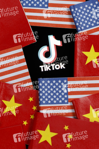 Das Logo der Video-App Tiktok auf einem Bildschirm umringt von chinesischen und US-Flaggen. Ein Richter hat Donald Trumps TikTok-Verbot für unwirksam erklärt. (Symbolfoto, Themenfoto)