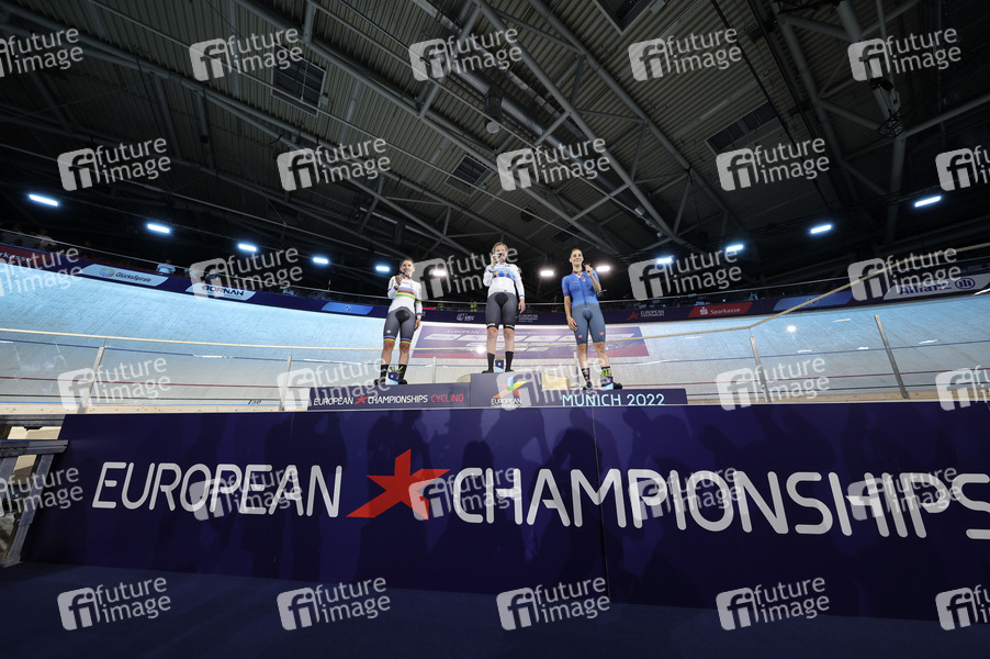 Lisa Brennauer, Mieke Kröger und Vittoria Guazzini bei der Siegerehrung Einerverfolgung Frauen bei den European Championships 2022 im Bahnradsport in der Messe München. München, 13.08.2022
