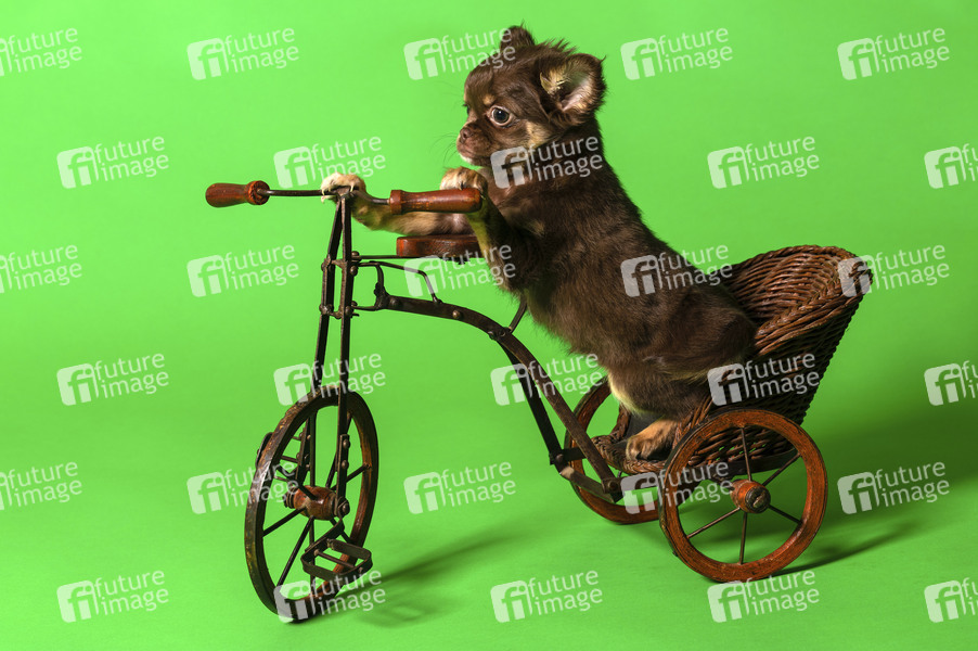 Chihuahua Buffy auf Dreirad bei einem Fotoshooting im Fotostudio Schubert. Niedernwöhren, 20.03.2019