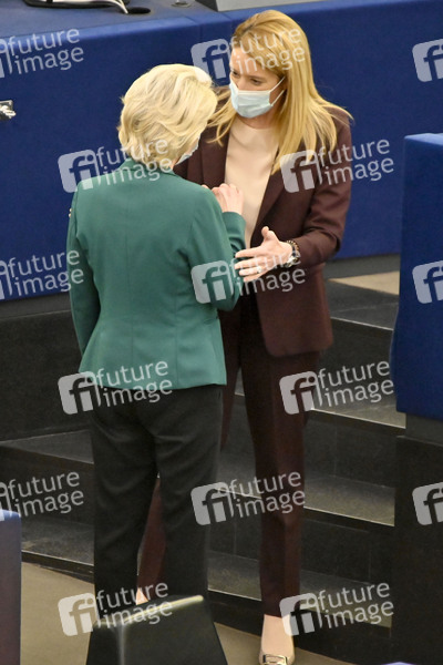 Ursula von der Leyen und Roberta Metsola bei einer Fragestunde zu zwei Jahren Kommission von der Leyen und die Umsetzung der politischen Prioritäten im Plenarsaal des Europäischen Parlaments. Straßburg, 05.04.2022