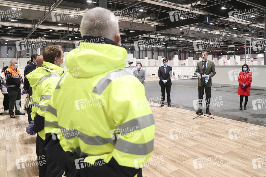 Notkrankenhaus, Kankenhaus, Klinik, Versorgung, Gesundheitssystem, Hilfe, Coronaviren, Virus, Viren, Corona, Covid-19, Coronavirus, Coronaviren, Corona-Virus, Corona-Viren, Ansteckungsgefahr, Epidemie, Pandemie, Infektion, Infektionen, Krankheit, Vorbeugung, Ausnahmezustand, Maßnahmen, Neuansteckungen, Coronamaßnahmen, Corona-Infektion, Corona-Infektionen, Adel, König von Spanien, Staatsoberhaupt, Fürst von Asturien, Fürst von Girona, Felipe de Borbón, Monarch, Royal