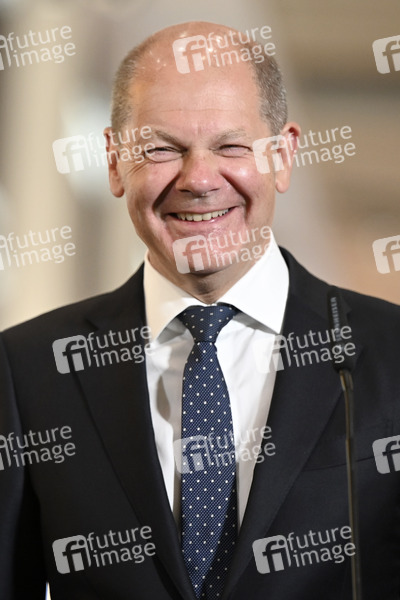 Olaf Scholz beim Pressestatement nach dem Eröffnungsrundgang auf der Hannover Messe 2022 auf dem Messegelände. Hannover, 30.05.2022