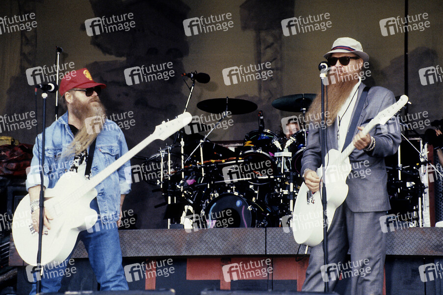 Dusty Hill, Frank Beard und Billy Gibbons von ZZ Top beim Soundcheck zum Konzert der 'Recycler World Tour' in der Milton Keynes Bowl. Milton Keynes, 06.07.1991
