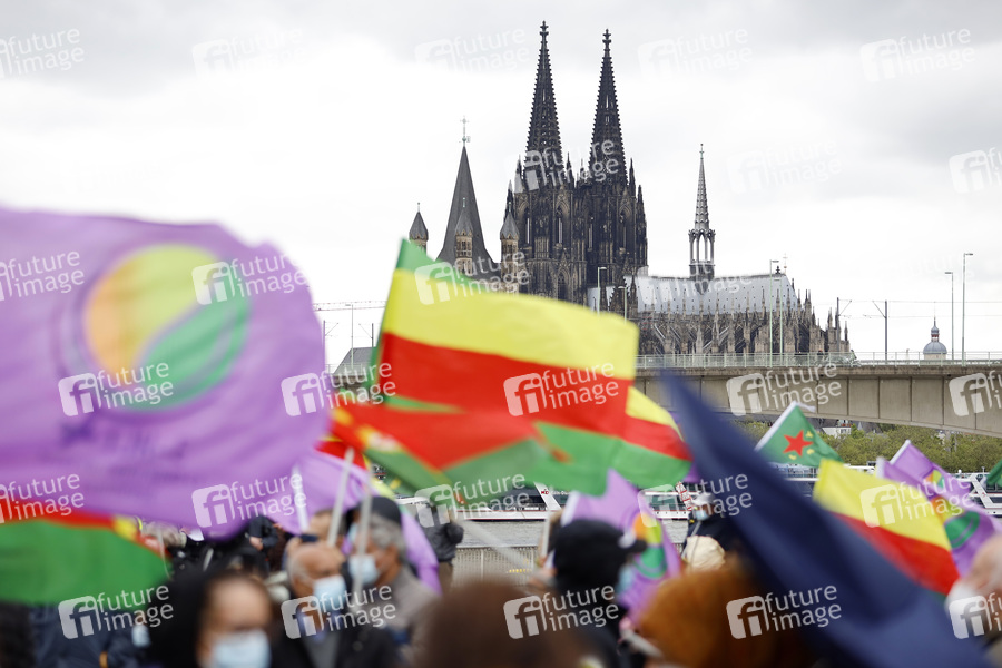 Bei der Versammlung 'Stoppt den Krieg in Kurdistan – Gedenken an die Gefallenen/Getöteten des Terrorstaats Türkei' in der Deutzer Werft demonstrierte man gegen die türkischen Militäroffensiven in den von Kurden besiedelten Gebieten in Nordsyrien und dem Nordirak. Köln, 22.05.2021