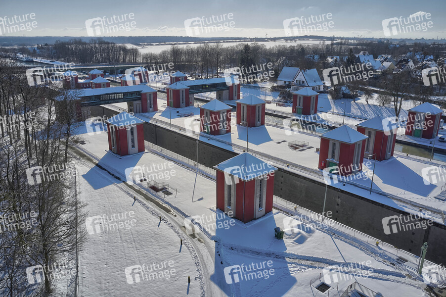 Schleuse Anderten, Wetter, verschneit, Schnee, Glätte, Eis, kalt, Wintereinbruch, Minustemperaturen, Winter, Winterwetter, Grenzwetterlage, Schneefälle, Schneefall, Frost, Wetterlage, Schiffahrt, Binnenschleuse, Kanal, Gewässer, Eisschollen, Drohne, Drohnen, Kameradrohne, Drohnenaufnahme