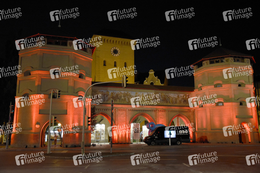 Beleuchtetes Isartor - Mit der bundesweiten Aktion 'Night of Light' macht die Veranstaltungsbranche auf ihre finanzielle Notlage durch die Corona-Krise aufmerksam. München, 22.06.2020