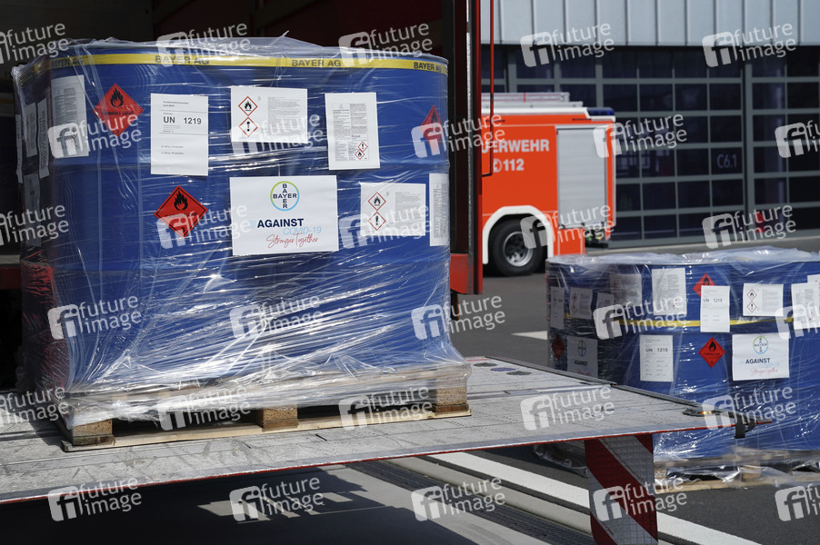 Die Firma Bayer spendet Desinfektionsmittel an die Stadt Köln. Hier bei der Übergabe in der Feuerwehrwache Köln-Kalk. Köln, 07.04.2020