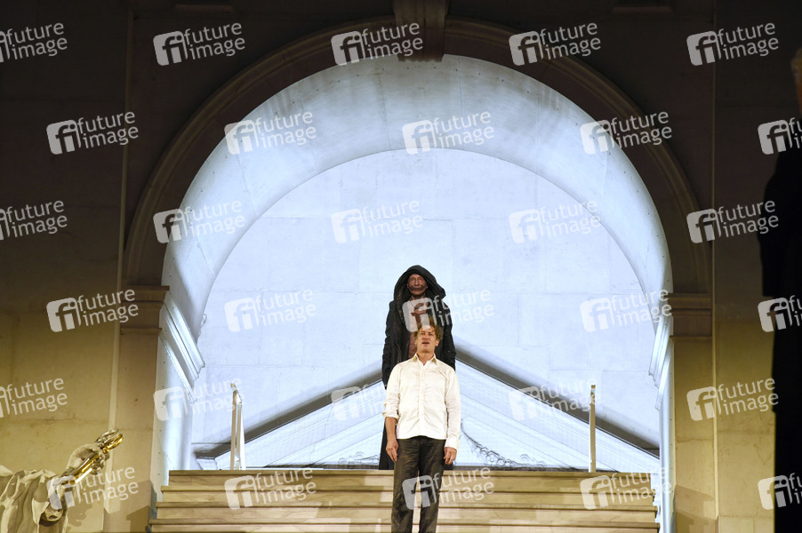 Peter Lohmeyer und Tobias Moretti bei der Fotoprobe zum Theaterstück 'Jedermann - Das Spiel vom Sterben des reichen Mannes' bei den Salzburger Festspielen 2020 auf dem Domplatz. Salzburg, 29.07.2020