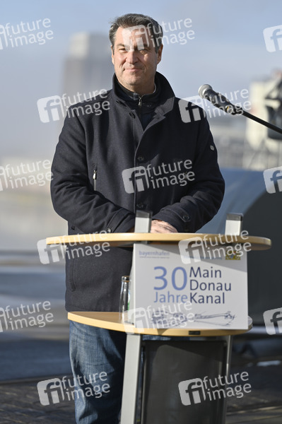 Markus Söder bei der Jubiläumsveranstaltung '30 Jahre Main-Donau-Kanal' am Bamberger Hafen. Bamberg, 25.11.2022