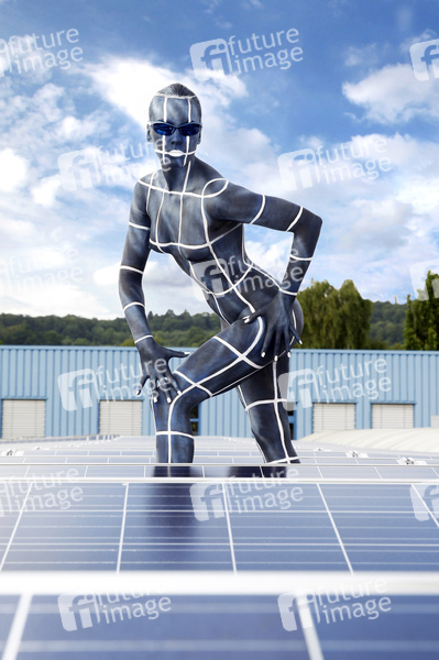 Solardach-Pflicht, Solarpflicht, Klimaschutz-Sofortprogramm 2022, Energie-Standard EH-55, Energie, Solarstrom, Solarzelle, Photovoltaik, Solarpanele, Solarenergie, Sonnenenergie, Solaranlage, Dach, Solarmodule, Nachhaltigkeit, Erneuerbare Energien, Energiewende, Solarzellen, Klima, Umwelt, Ökostrom, Umweltschutz, Body-Painting, Akt, Körperkunst, Körperfarben, Farbe, Bemalung, Kunst, Malerei, Beruf, Solarteur, Strom, Symbolfoto, Symolbild, Model Release