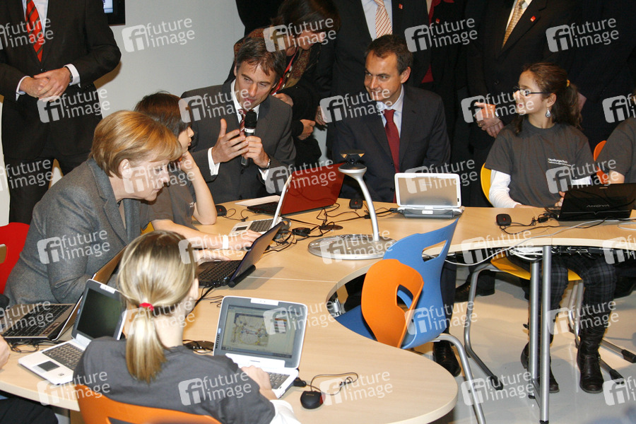 Eröffnungsrundgang von Bundeskanzlerin Merkel und Spaniens Ministerpräsident Zapatero auf der CeBIT 2010 (Centrum der Büro- und Informationstechnik), der weltgrößten Messe für Informations- und Computertechnik auf dem Messegelände in Hannover. Im digitalen Klassenraum von Microsoft