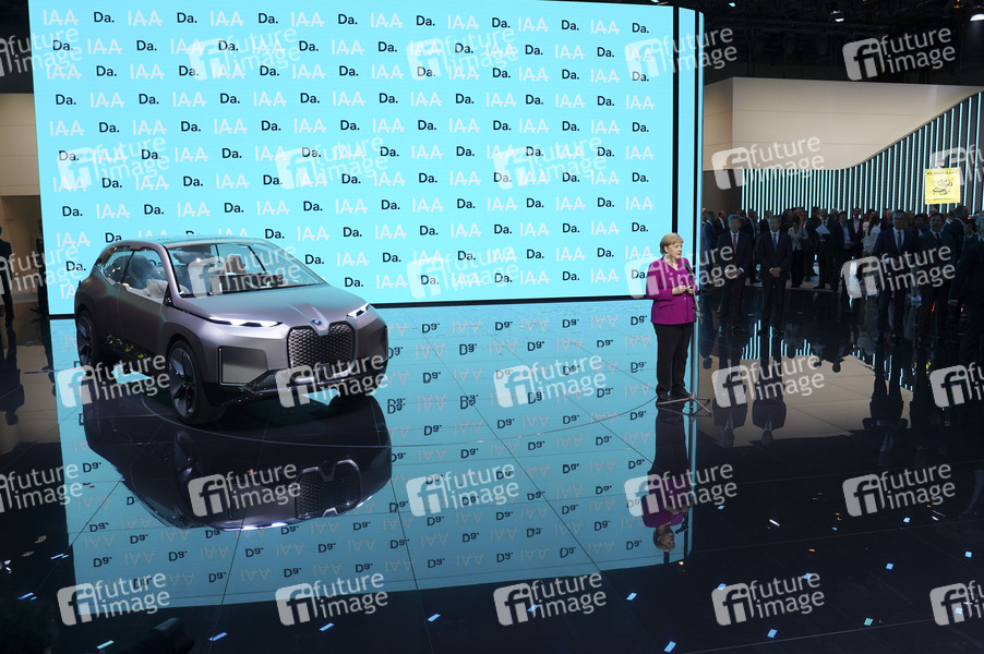 Angela Merkel beim Abschlussstatement am Messestand von BMW beim Eröffnungsrundgang auf der Internationalen Automobil-Ausstellung 2019 auf dem Messegelände. Frankfurt am Main, 12.09.2019