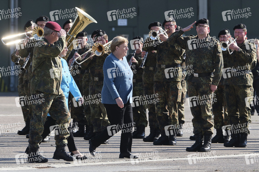 General Eberhard Zorn, Bundeskanzlerin Angela Merkel und Verteidigungsministerin Annegret Kramp-Karrenbauer bei einem Appell für die Soldatinnen und Soldaten der Evakuierungsmission in Kabul und dem Feierlichen Gelöbnis von Rekruten des Fallschirmjägerregiments 31 in der Fallschirmjägerkaserne Seedorf. Seedorf, 22.09.2021