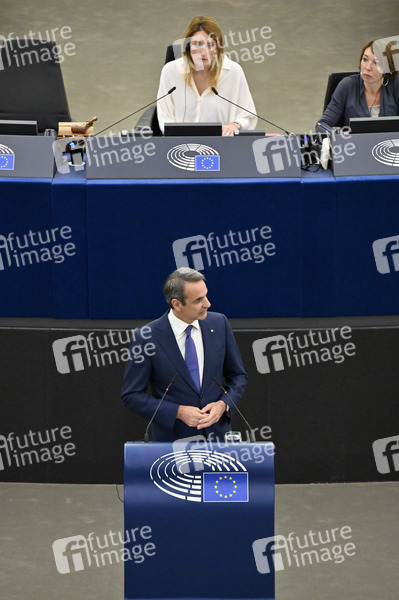 Kyriakos Mitsotakis (mit Roberta Metsola) spricht vor dem Parlament im Plenarsaal des Europäischen Parlaments. Straßburg, 05.07.2022