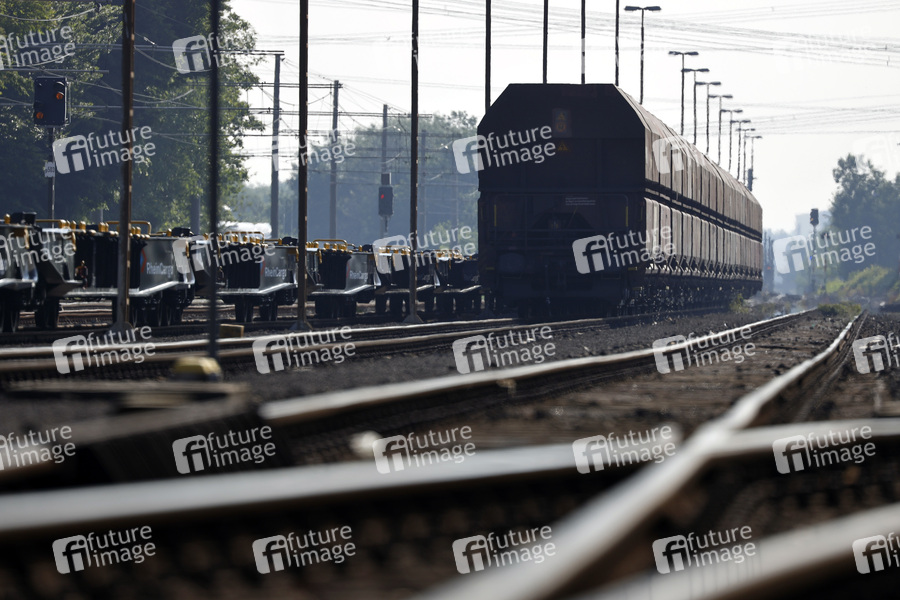 Güterwagons auf einem Rangiergleis am Bahnhof Frechen. Fotografiert aus dem öffentlichen Raum. (Themenbild, Symbolbild) Frechen, 14.06.2021