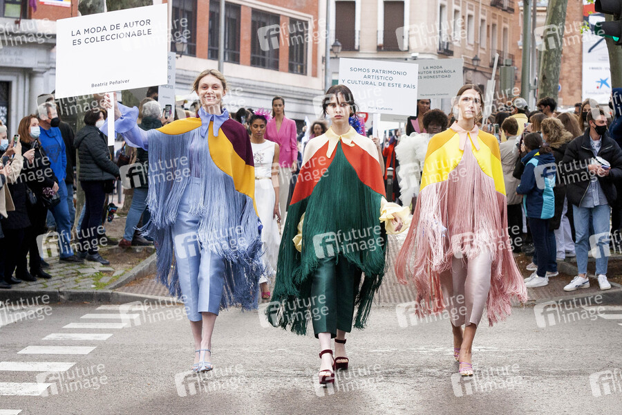 Fashion Show von 10 Modedesignern, die konzipiert wurden, um die charakteristische Mode zu feiern und ihre Rolle in der spanischen Wirtschaft und Kultur zurückzugewinnen auf dem Paseo del Prado. Madrid, 11.04.2021