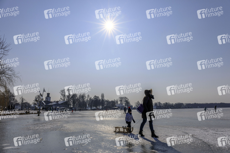 Das Steinhuder Meer ist im Uferbereich zugefroren, aber nicht offiziell freigegeben Trotzdem laufen viele Leute auf die Eisfläche. Wunstorf, 12.02.2021