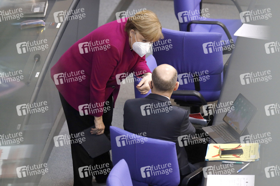 Angela Merkel und Olaf Scholz in der 218. Sitzung des Deutschen Bundestages im Reichstagsgebäude. Berlin, 25.03.2021
